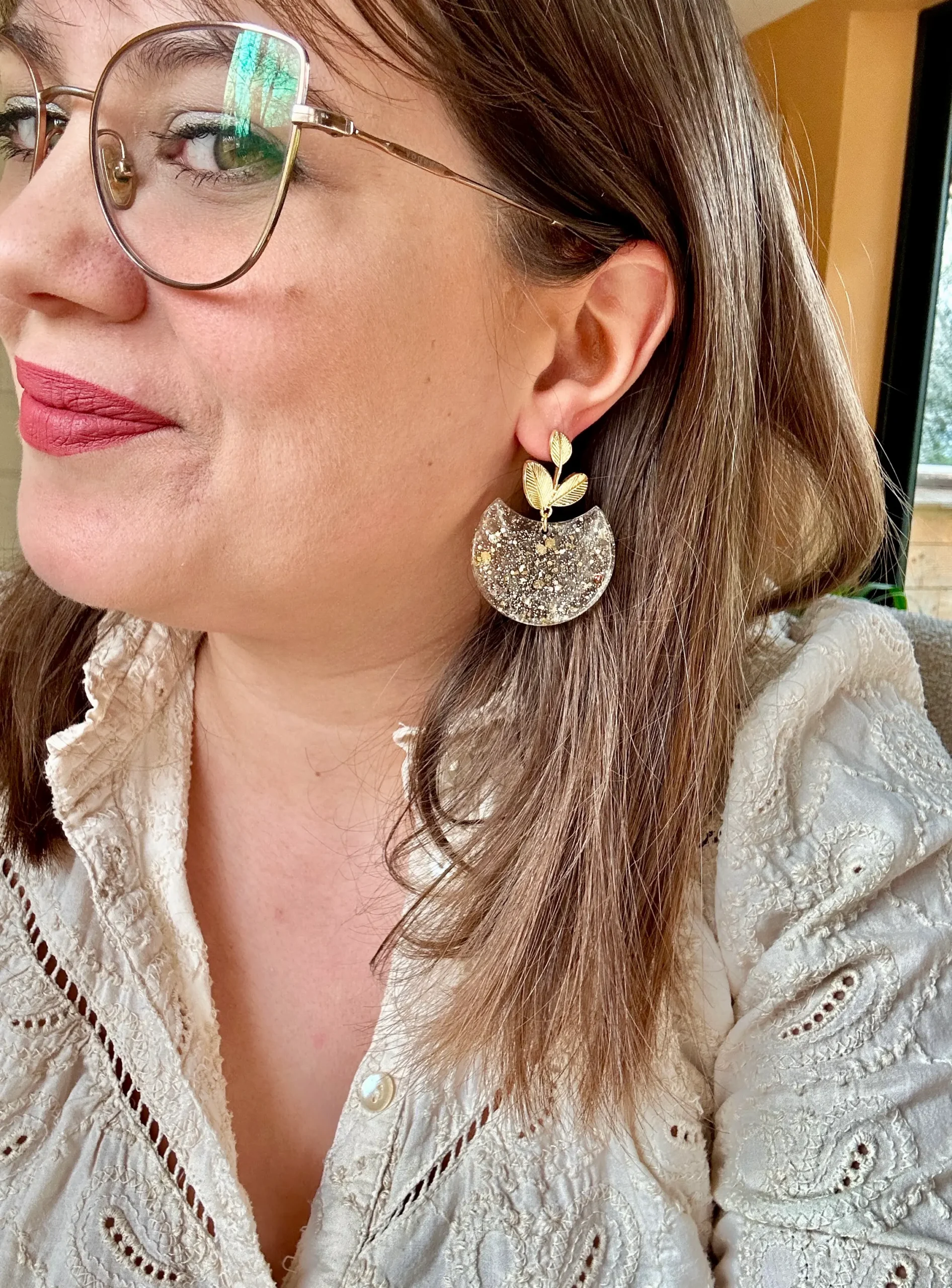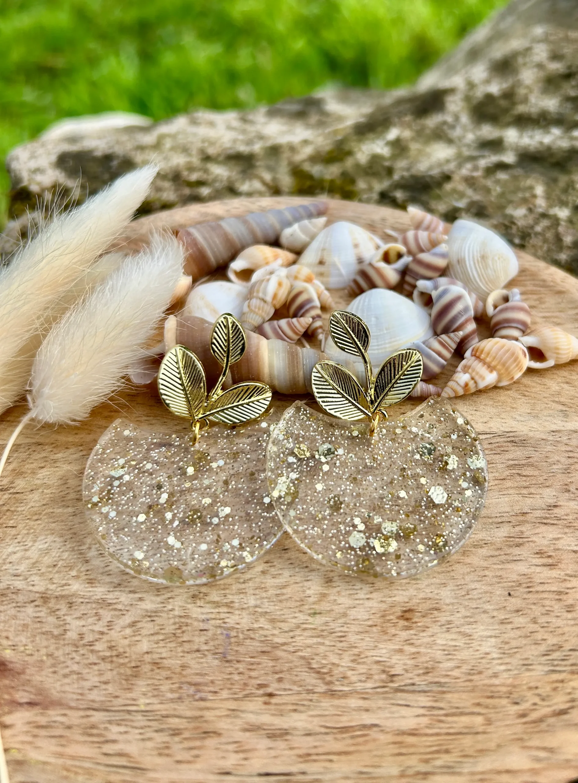 Chaque paire de boucles d’oreilles est réalisée avec soin, ce qui rend chaque création unique. La répartition des paillettes dorées dans la résine peut varier légèrement, offrant un rendu naturel et authentique.