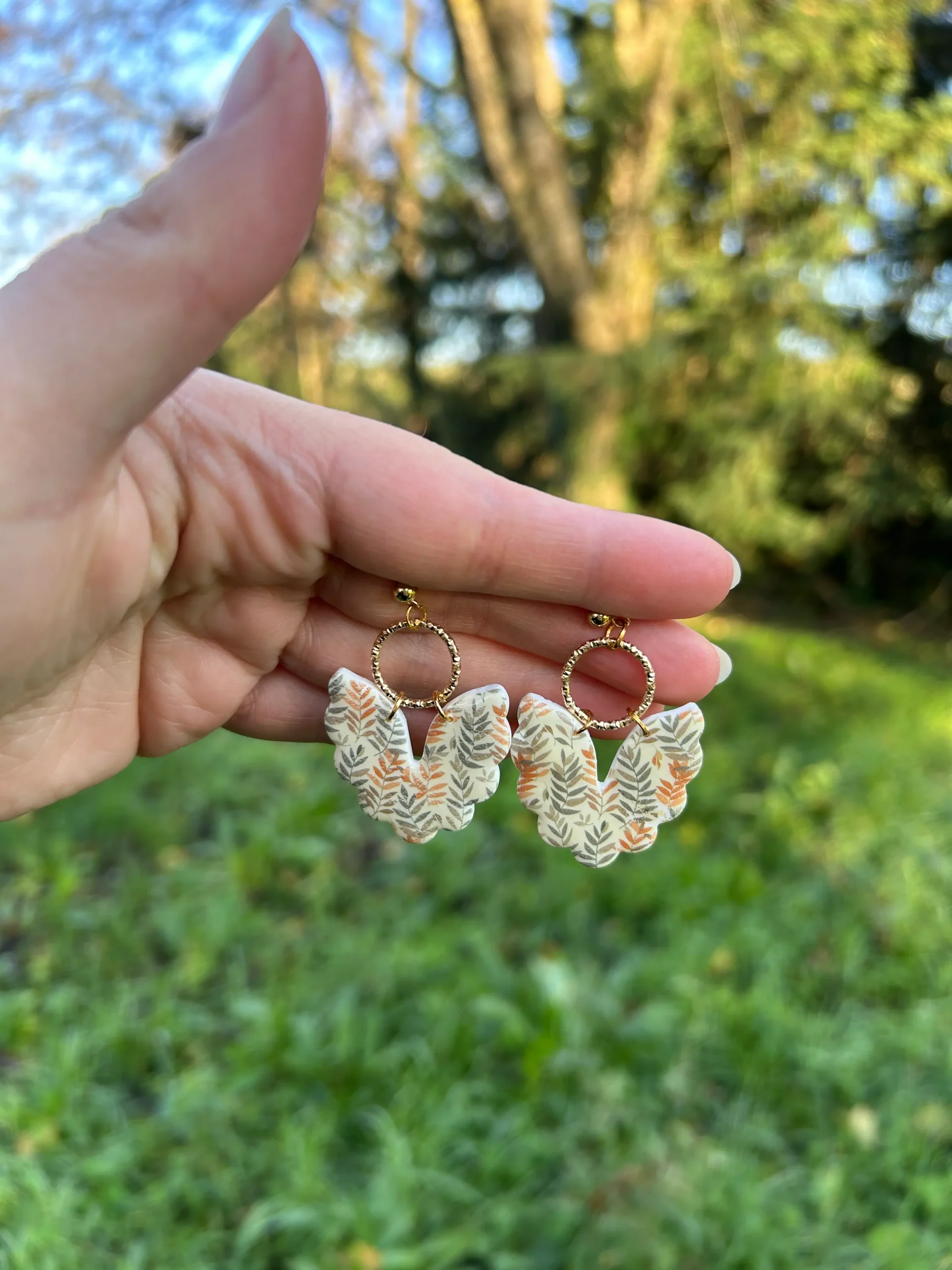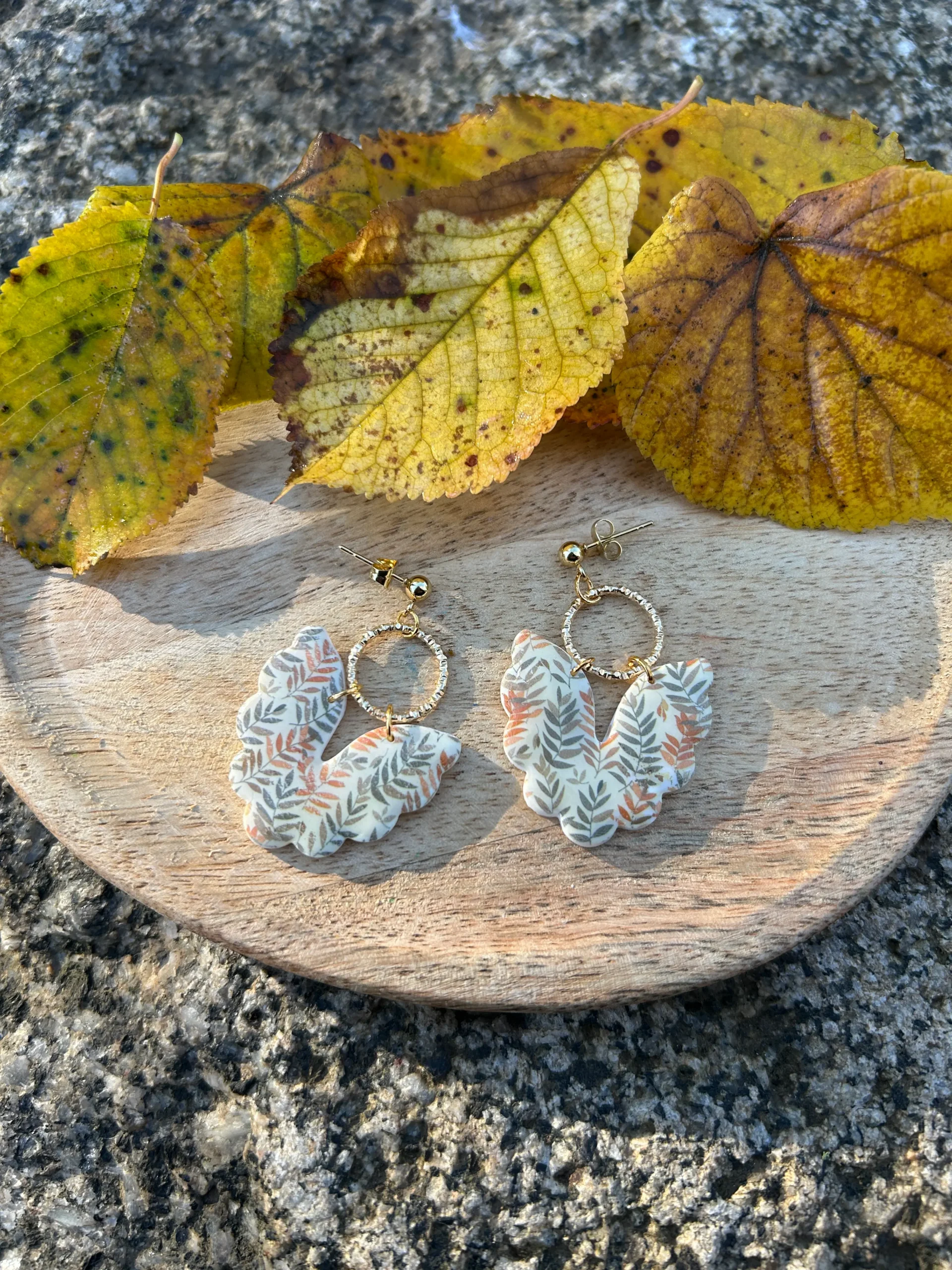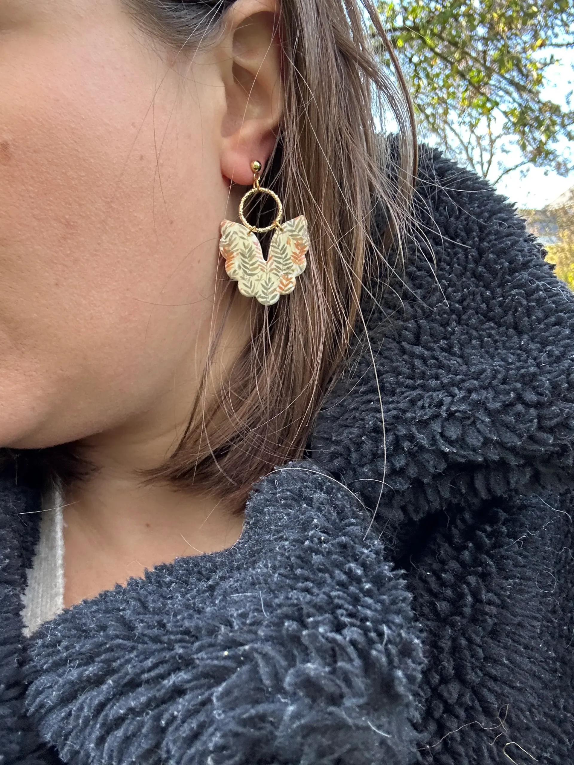 Ces boucles d’oreilles sont de véritables bijoux bohème, pensées pour celles qui aiment porter la nature au bout des oreilles. Leur design unique, en forme de feuilles délicatement courbées, présente un motif végétal aux tons doux et chaleureux : beige naturel, vert sauge et orange terre cuite. Ainsi, elles évoquent immédiatement l’atmosphère apaisante des balades en forêt, la beauté des feuilles d’automne et le charme des matières organiques.