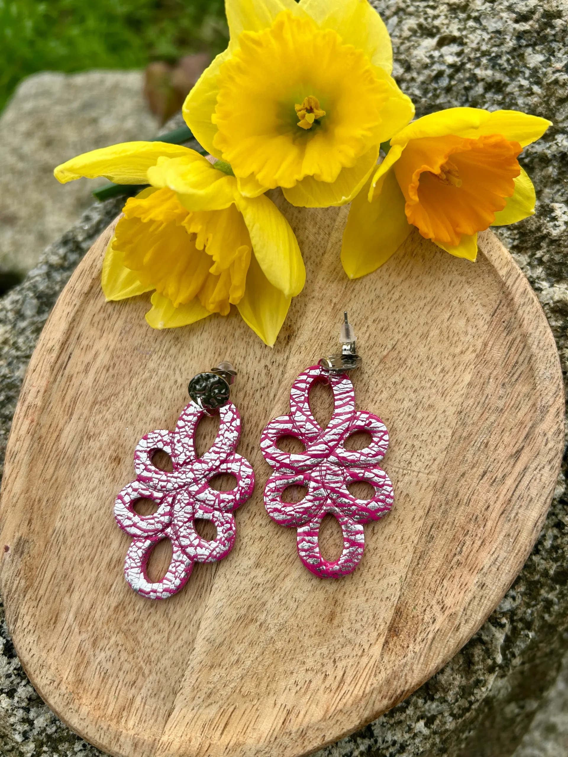 Confectionnées en pâte polymère, ces boucles d’oreilles sont très légères, ce qui garantit un confort optimal tout au long de la journée. La pâte polymère permet de créer des formes précises et originales comme l’entrelacé, tout en offrant solidité et durabilité.