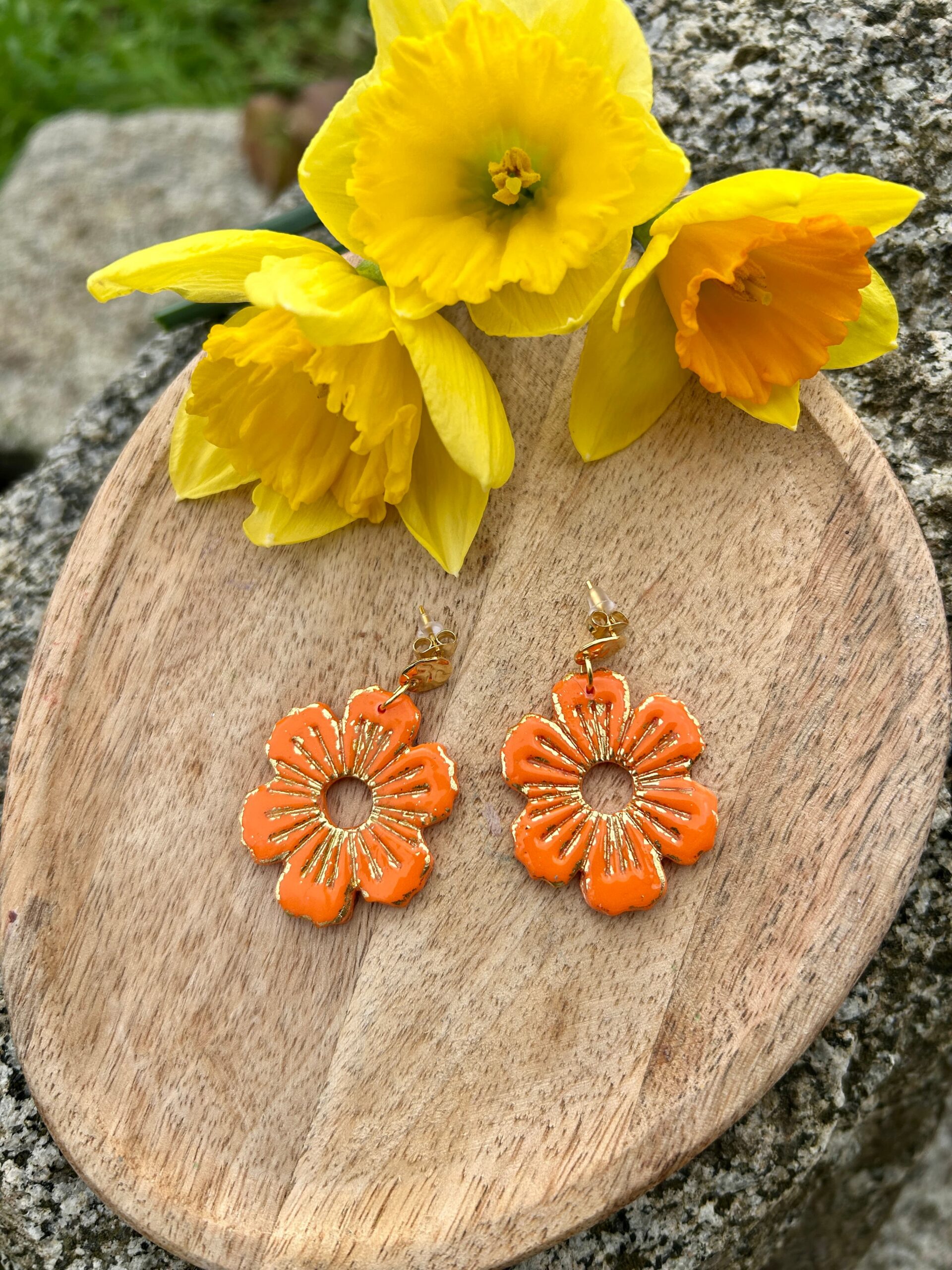 Boucles d’oreilles fantaisie fleur en pâte polymère, couleurs peps mandarine ou framboise. Légères, bohème chic et lumineuses.