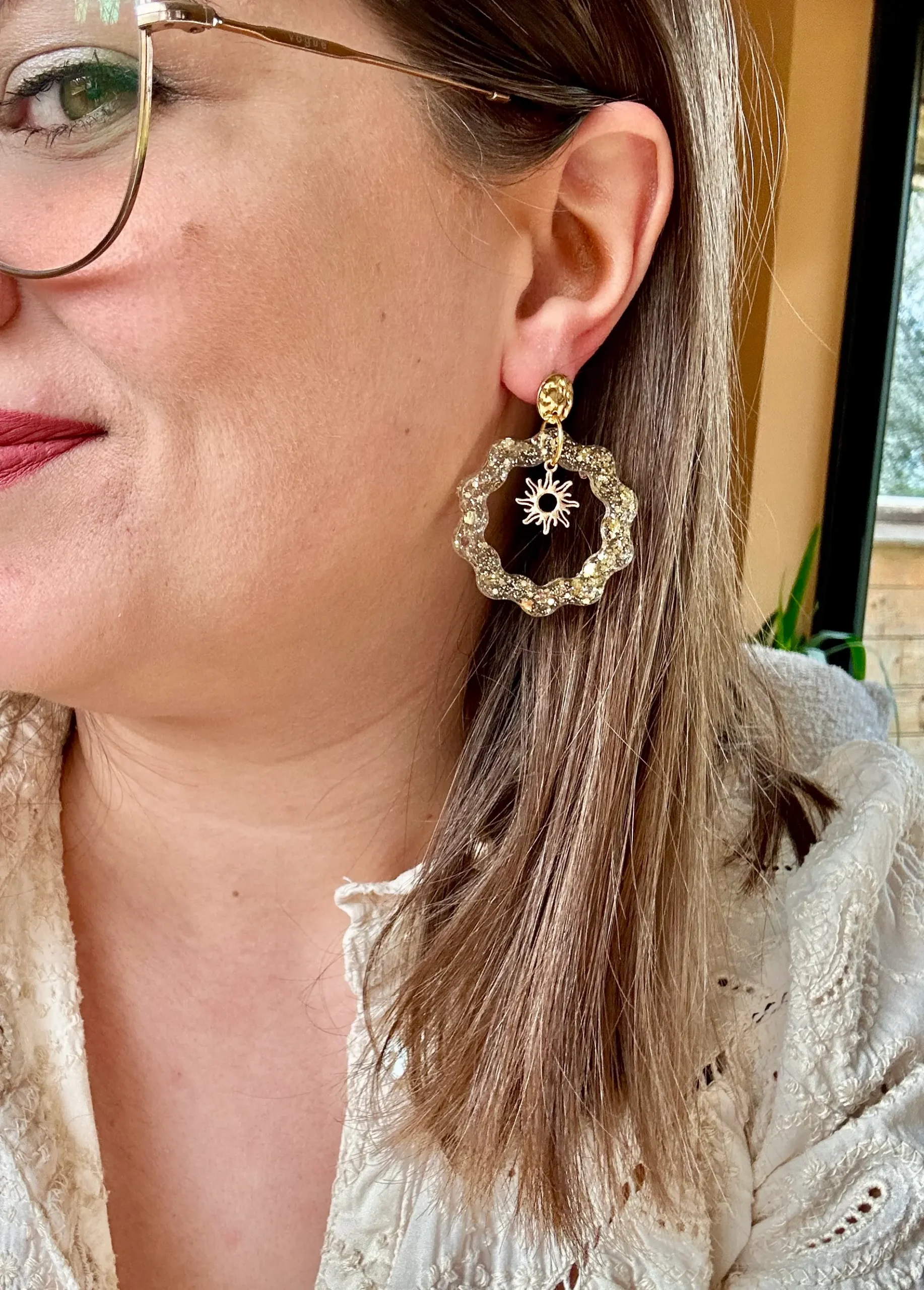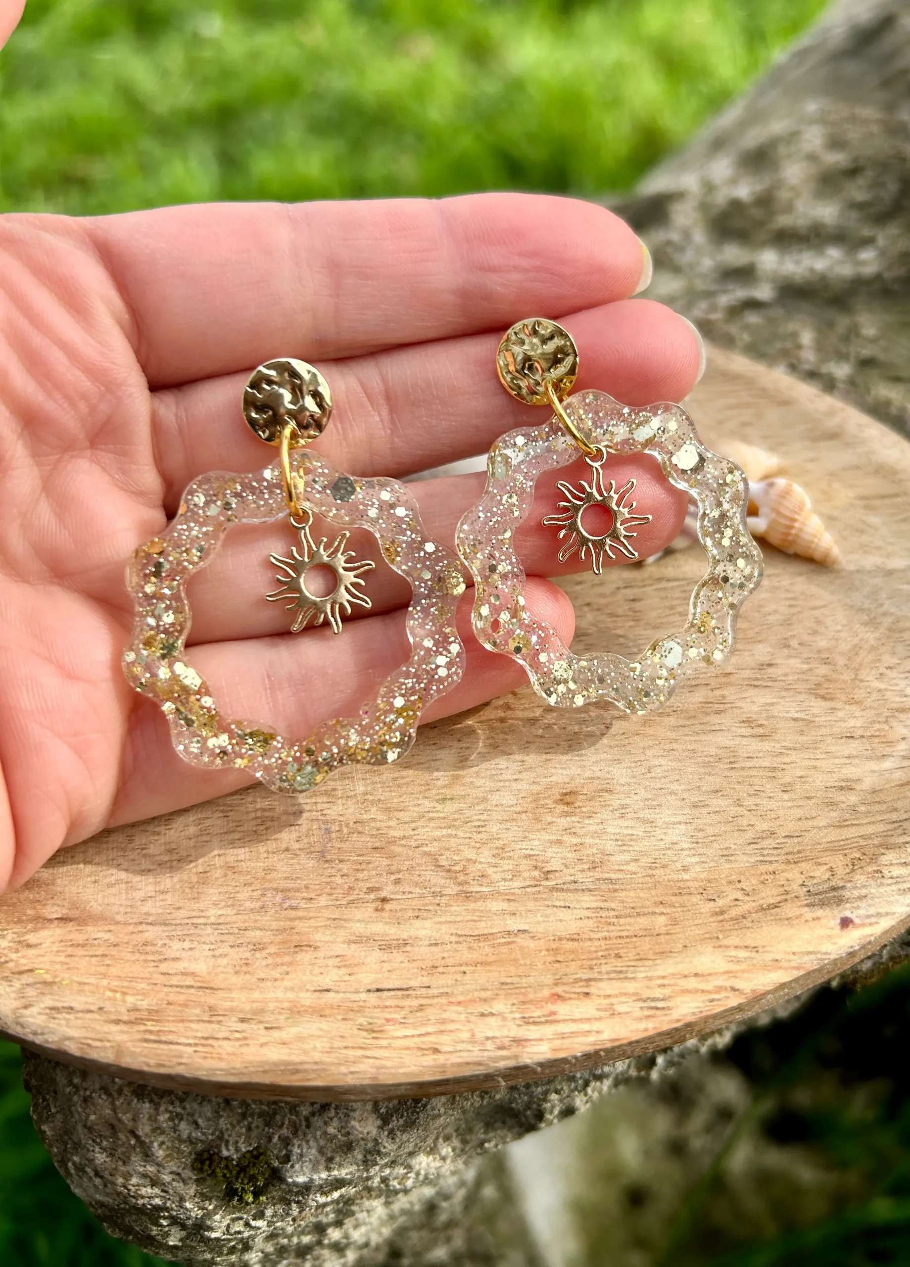 Boucles d’oreilles lumineuses en résine pailletée dorée avec pendentif soleil et attache en acier inoxydable. Un bijou bohème parfait pour une cérémonie ou un look de vacances. ✨