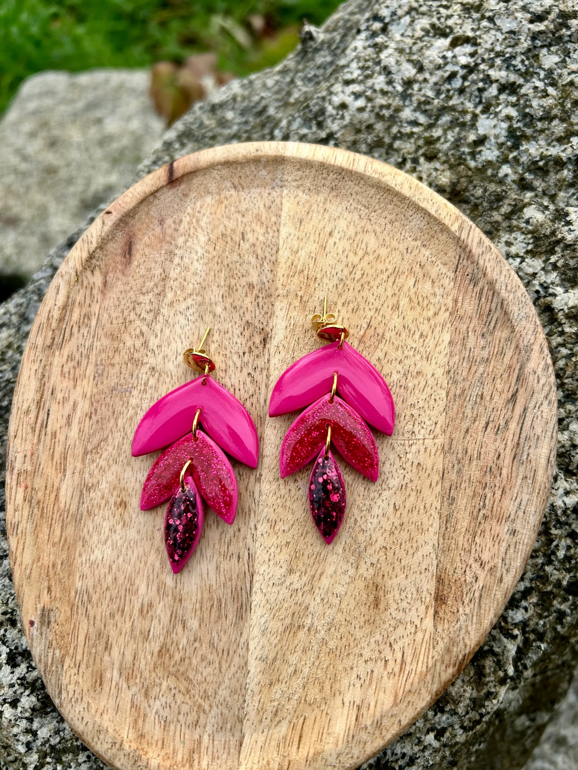 Boucles d’oreilles pendantes en forme de feuilles, pâte polymère, couleurs peps mandarine ou framboise, finition résine pailletée.