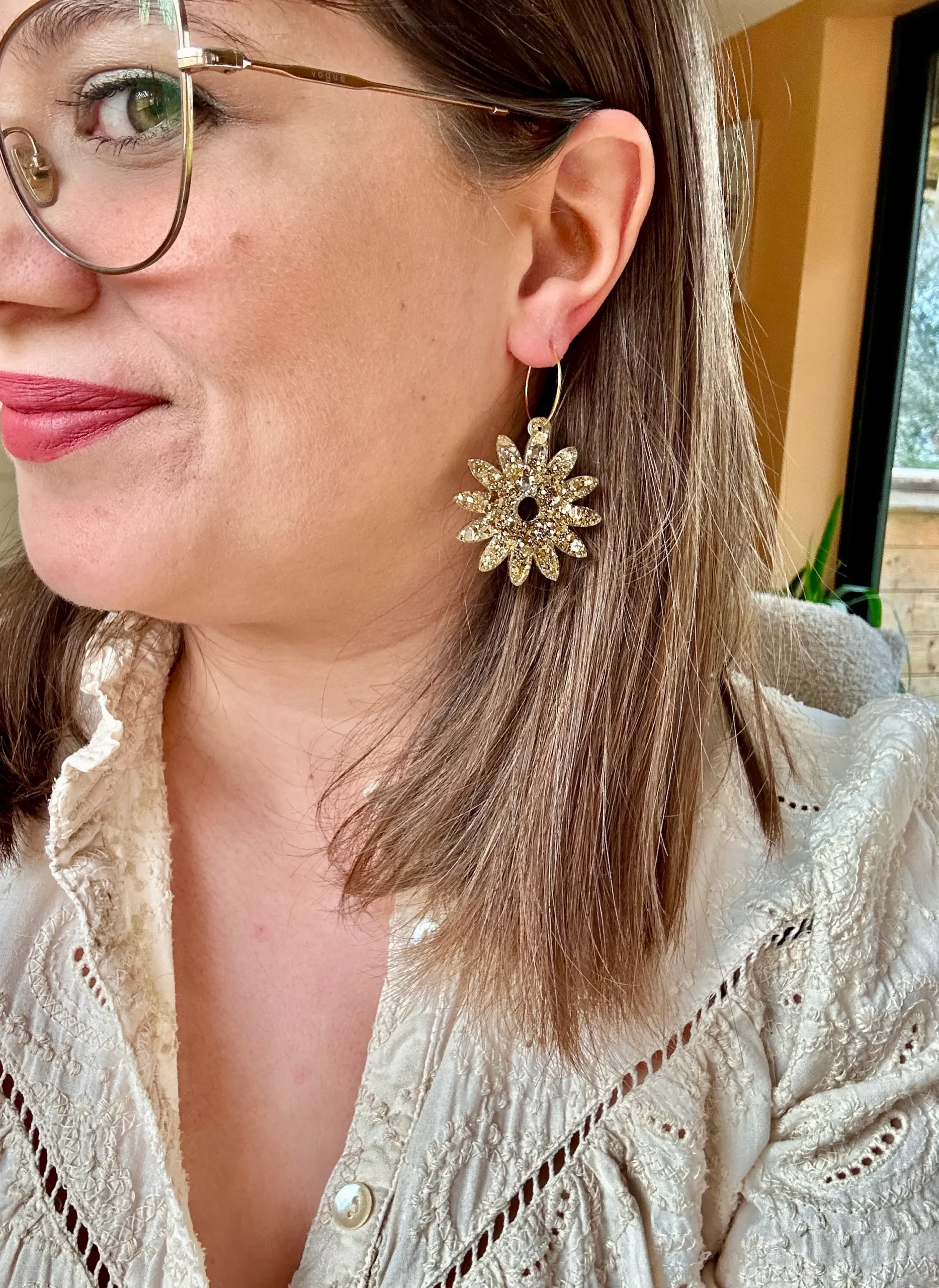 La pièce centrale représente un soleil en résine transparente, délicatement décoré de paillettes dorées. Grâce à la transparence de la résine, la lumière traverse la matière et crée de magnifiques reflets lumineux. Ainsi, les boucles d’oreilles captent la lumière et apportent immédiatement une touche pétillante à votre tenue.