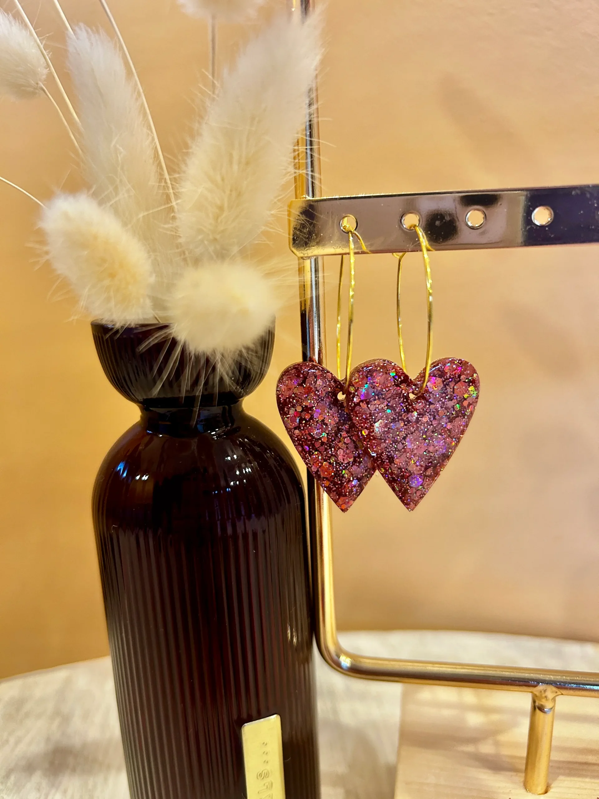 Boucles d’oreilles cœur en résine pailletée, pampilles interchangeables sur créoles en acier inoxydable. Disponibles en plusieurs couleurs.