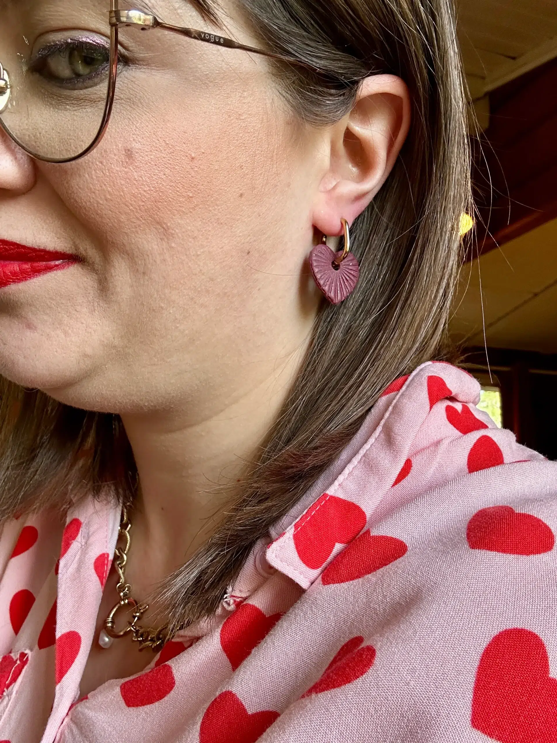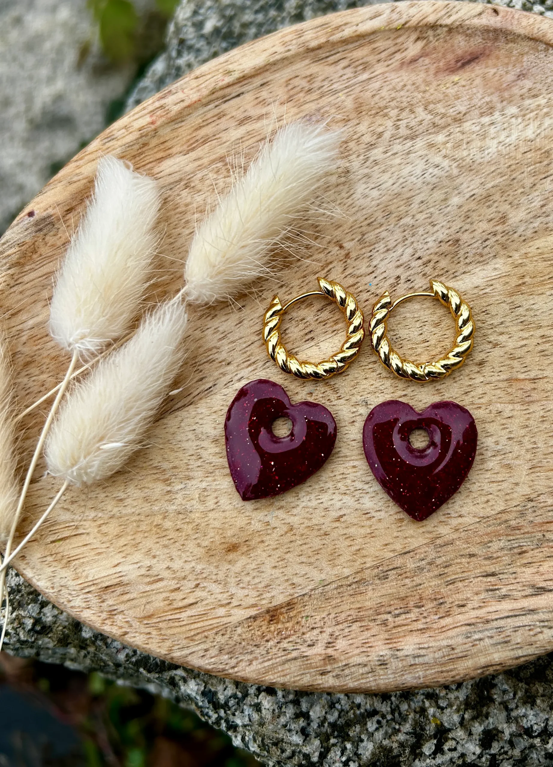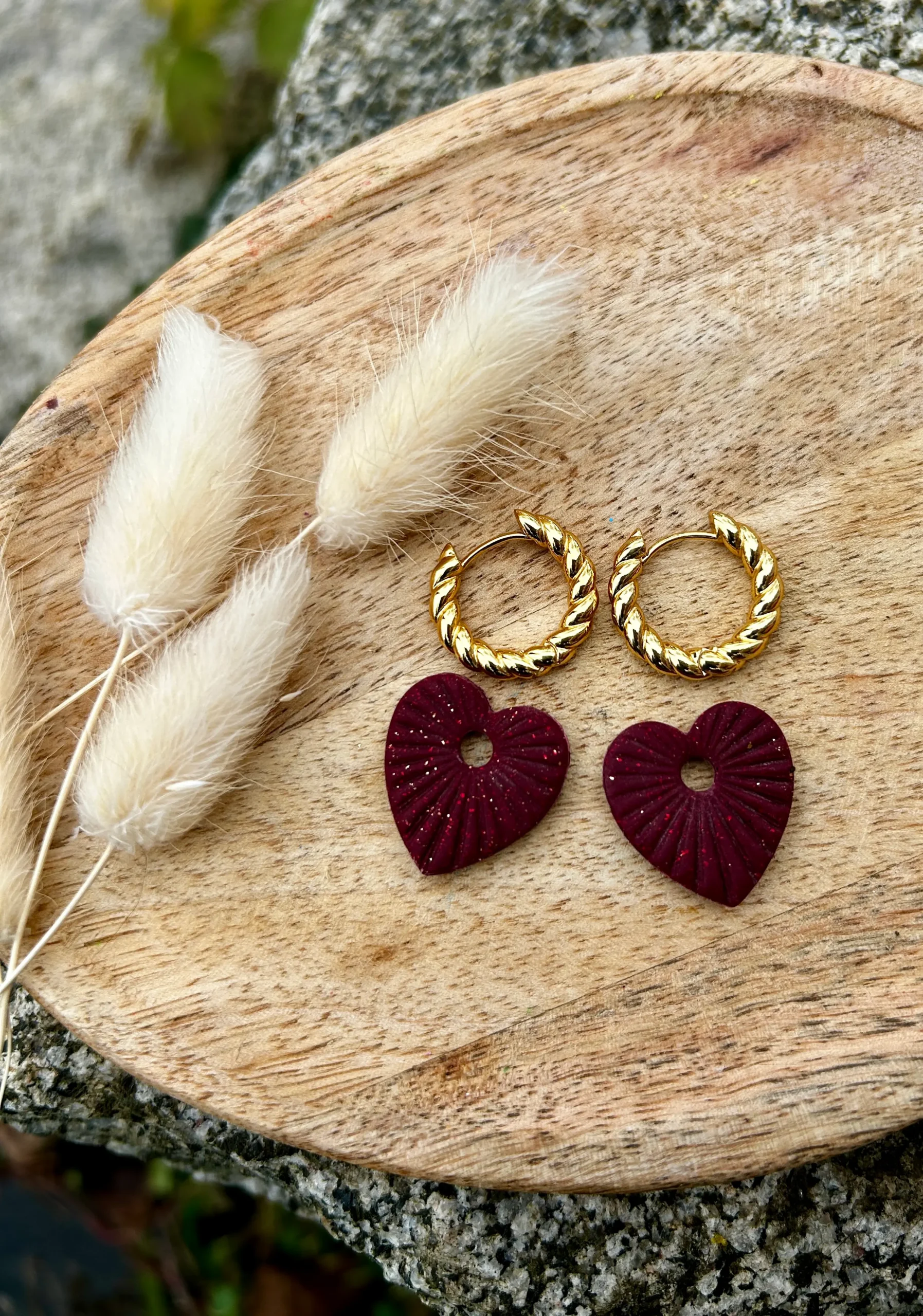 Pampilles cœur bohème bordeaux, réversibles avec un côté strié et un côté pailleté doré. Des bijoux Saint-Valentin intenses et interchangeables.